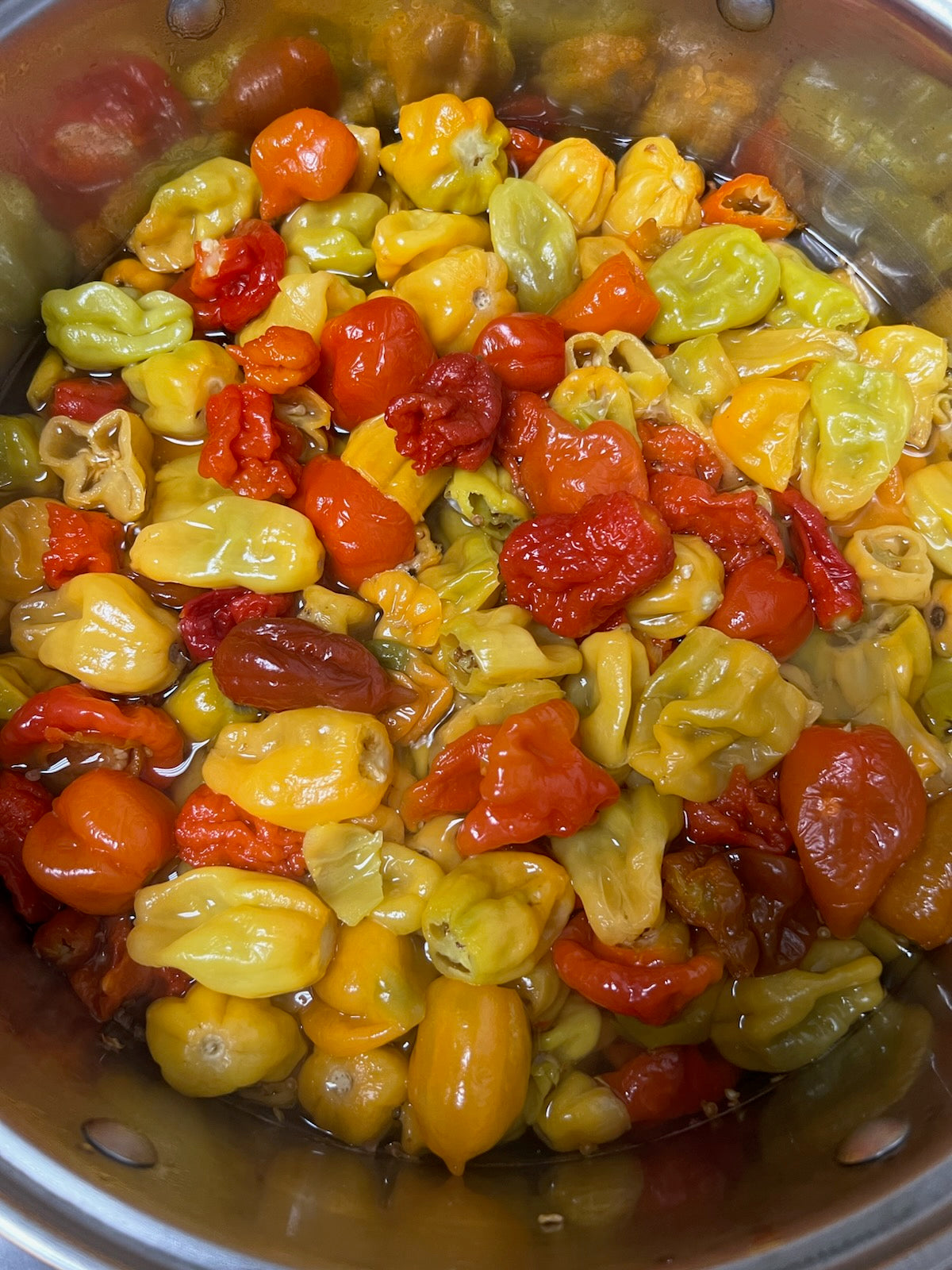 All batches of the 2024 season hot sauce contains habanero, chocolate habanero, scotch bonnet, red habanero, 7 pot douglah, chocolate, bhut jalokia (ghost pepper), Trinidad scorpion, and Carolina reaper.